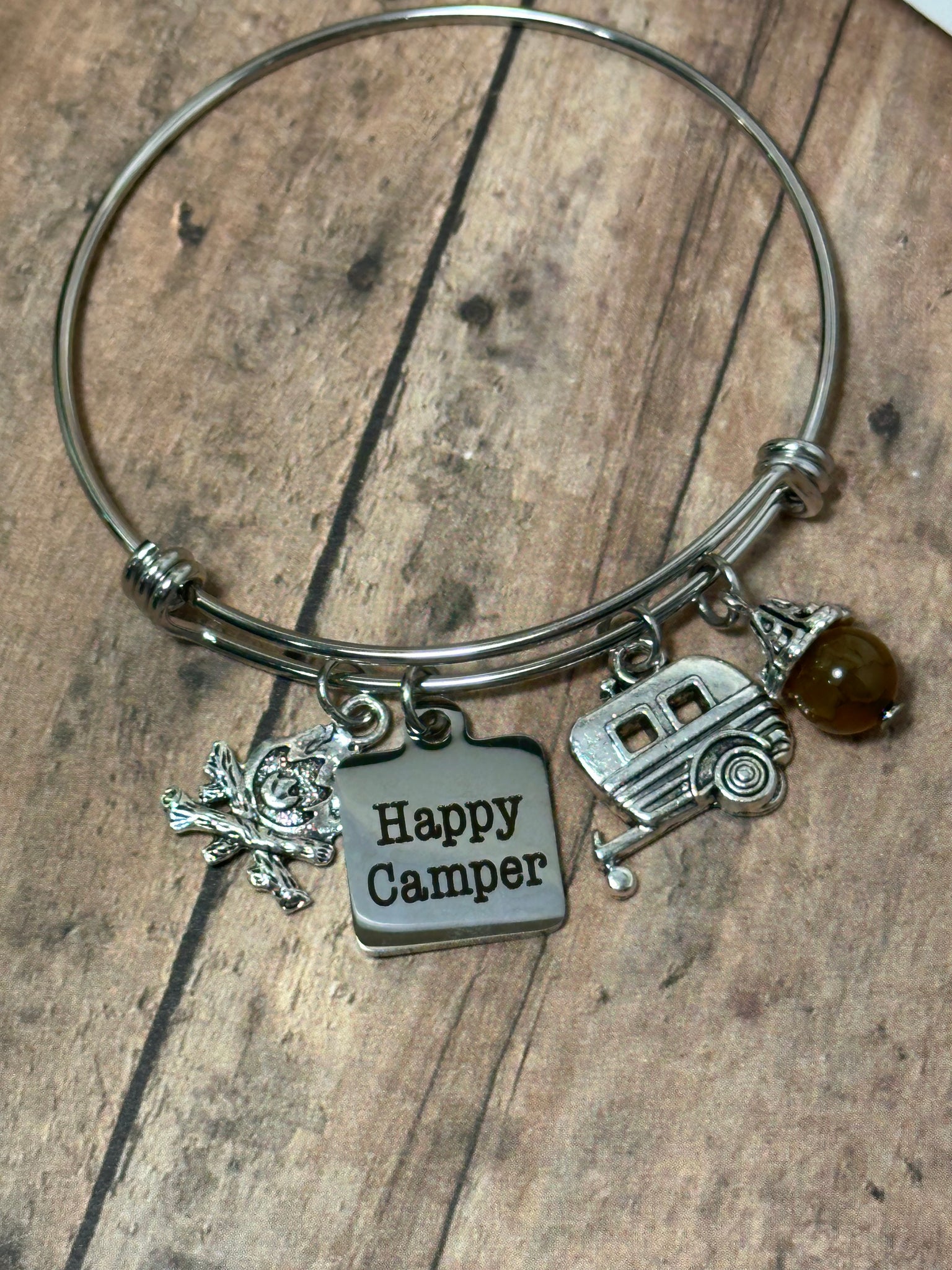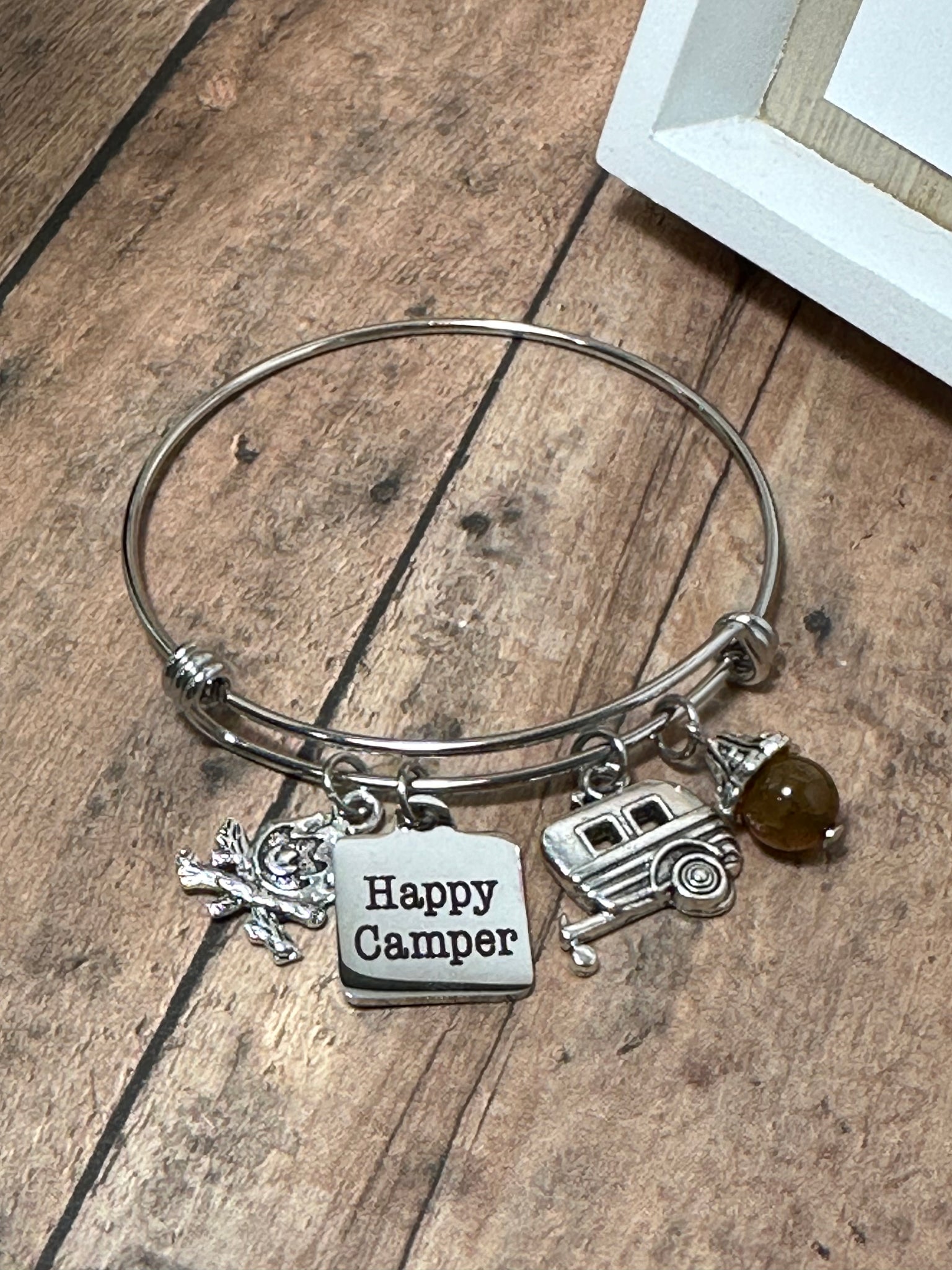 Adjustable charm bangle.  You pull to expand the bangle and then squeeze it back in place.  This is a standard 60mm smooth stainless-steel bangle that fits most.  55mm (Tween/Small Adult) and 65mm (Plus) sizes are available upon request.  Each bangle comes with three charms and one bead.  The laser-engraved charm is the key focal point of the bracelet.
