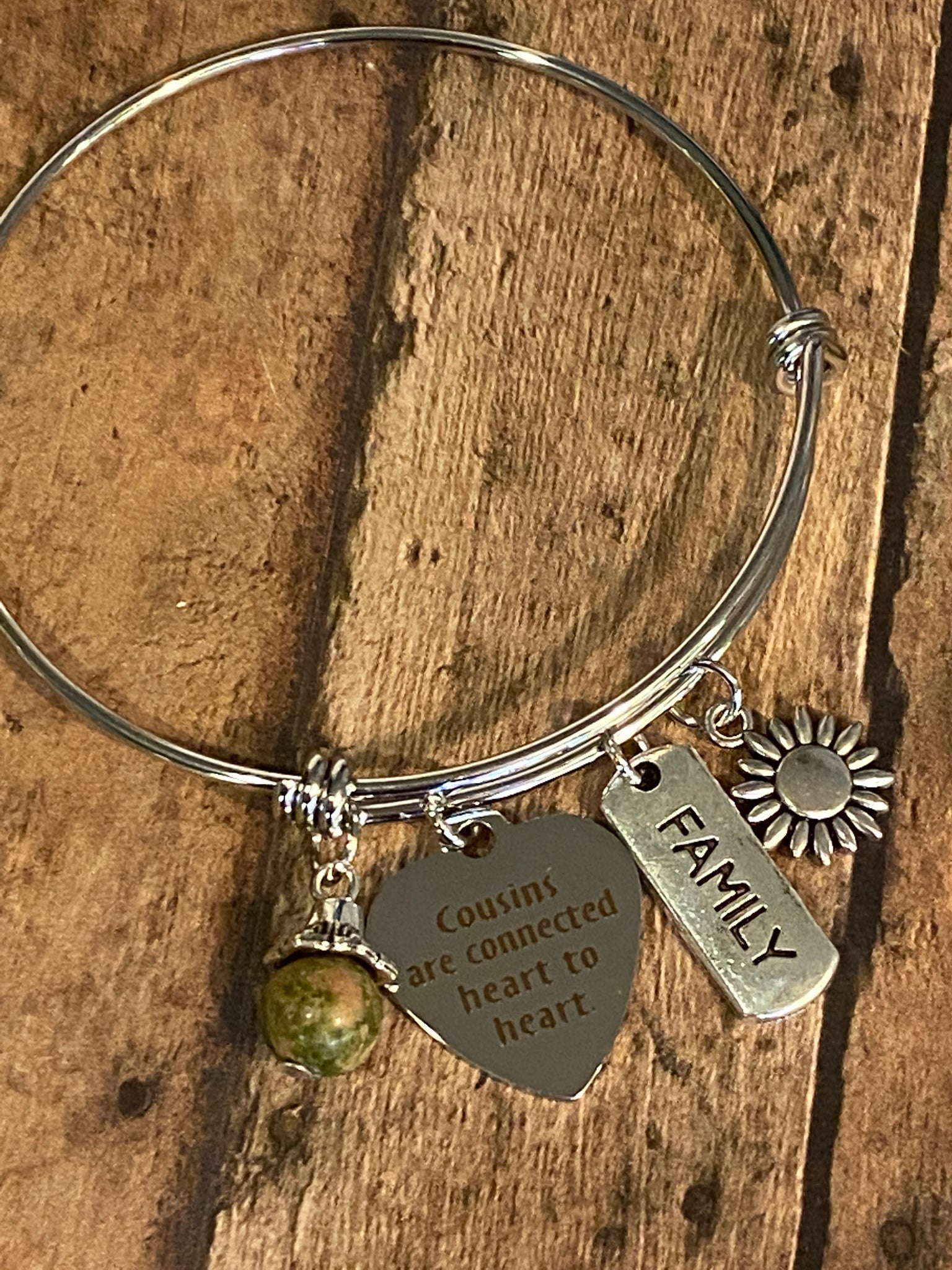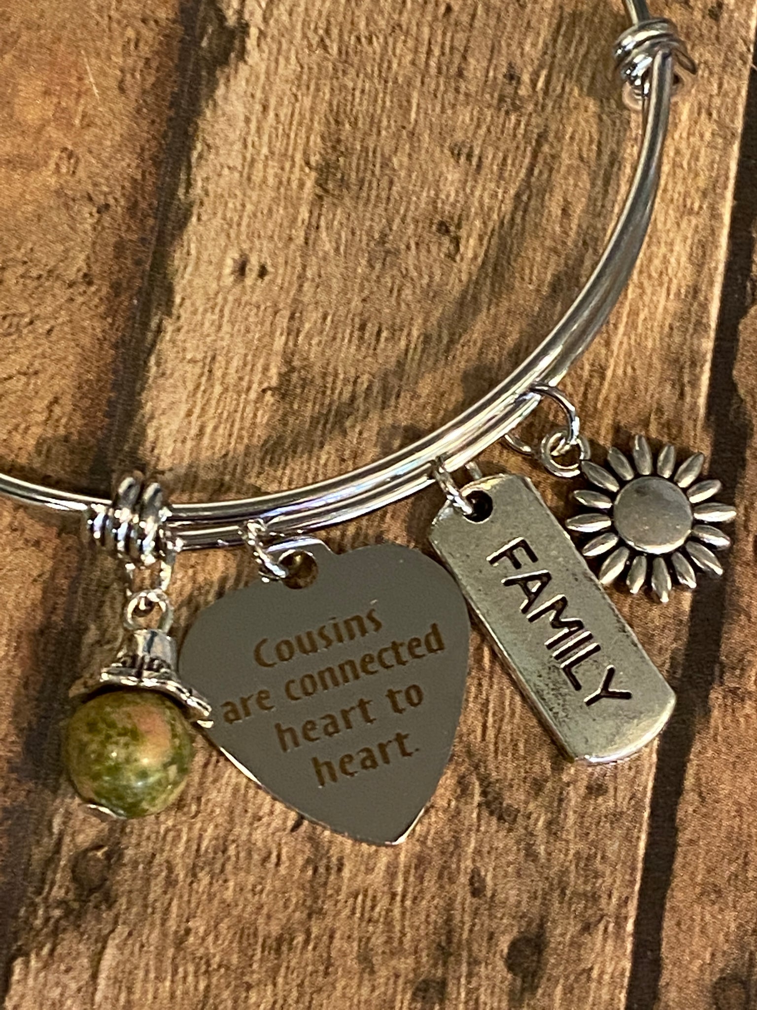 "Cousins Are Connected Heart to Adjustable charm bangle. You pull to expand the bangle and then squeeze it back in place. This is a standard 60mm smooth stainless-steel bangle that fits most. 55mm (Tween/Small Adult) and 65mm (Plus) sizes are available upon request. Each bangle comes with three charms and one bead. The laser-engraved charm is the key focal point of the bracelet.