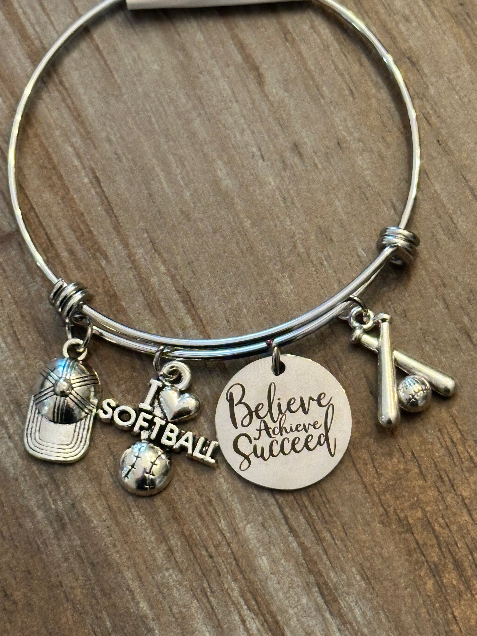 Adjustable charm bangle. You pull to expand the bangle and then squeeze it back in place. This is a standard 60mm smooth stainless-steel bangle that fits most. 55mm (Tween/Small Adult) and 65mm (Plus) sizes are available upon request. Each bangle comes with three charms and one bead. The laser-engraved charm is the key focal point of the bracelet.